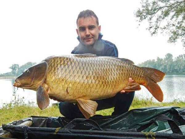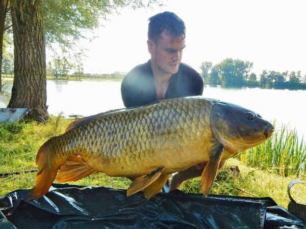 Hacia las 11 de la mañana, mi hermano pequeño Arjen Kooistra consiguió una carrera en una de las cañas del medio. Ésta no se había disparado antes. Mi hermano seguía roncando, así que lo desperté rápidamente porque era su turno. El pez vino hacia nosotros con bastante rapidez, y en el agua clara pudimos ver inmediatamente que era un cubo de vieira común. Por desgracia, el pez también nos vio y se alejó una y otra vez hacia las profundidades. Tras unos 30-45 minutos, por fin conseguimos recoger esta vieira común primigenia, aunque con una longitud de un metro apenas cabía en la red. Con este pez de 44 libras, ¡nuestra salida de pesca fue un éxito instantáneo! ¡Y también conseguimos mejorar el récord del lago!